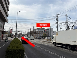 けやき通りを南へ進み中区役所に隣接している浜3丁目交差点を直進します。 -